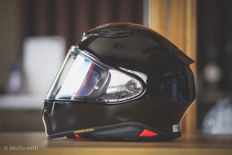 SHOEIのヘルメットはピンロックシートが標準装備です。これをつけるとインナーが曇らなくなるので、寒い季節に乗るときには個人的には必須のアイテムです。
